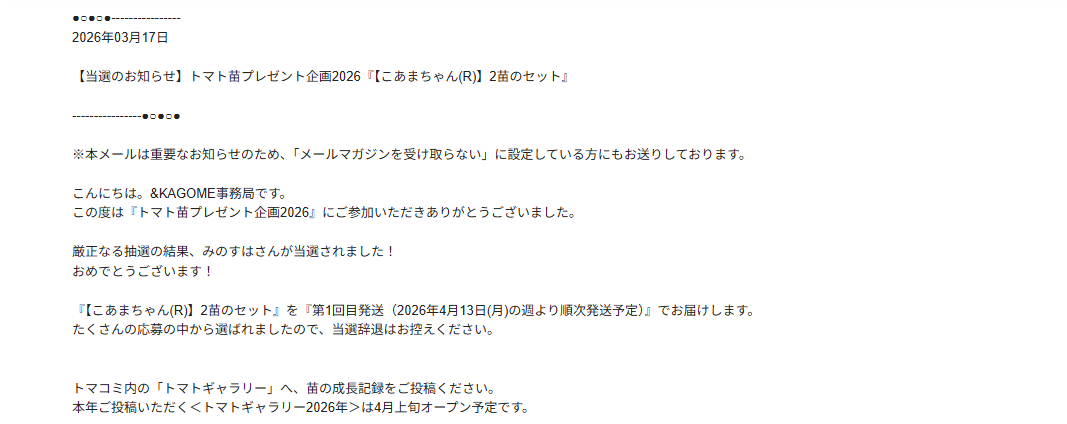 栽培を始めたらお伝えします。